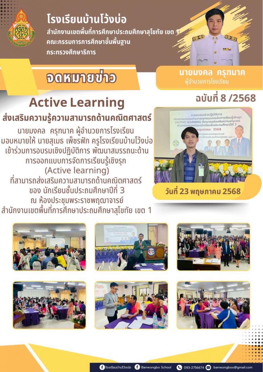 ครูโรงเรียนบ้านโว้งบ่อ เข้าร่วมการอบรมเชิงปฏิบัติการ พัฒนาสมรรถนะด้านการออกแบบการจัดการเรียนรู้เชิงรุก (Active learning) ที่สามารถส่งเสริมความสามารถด้านคณิตศาสตร์ ของ นักเรียนชั้นประถมศึกษาปีที่ 3