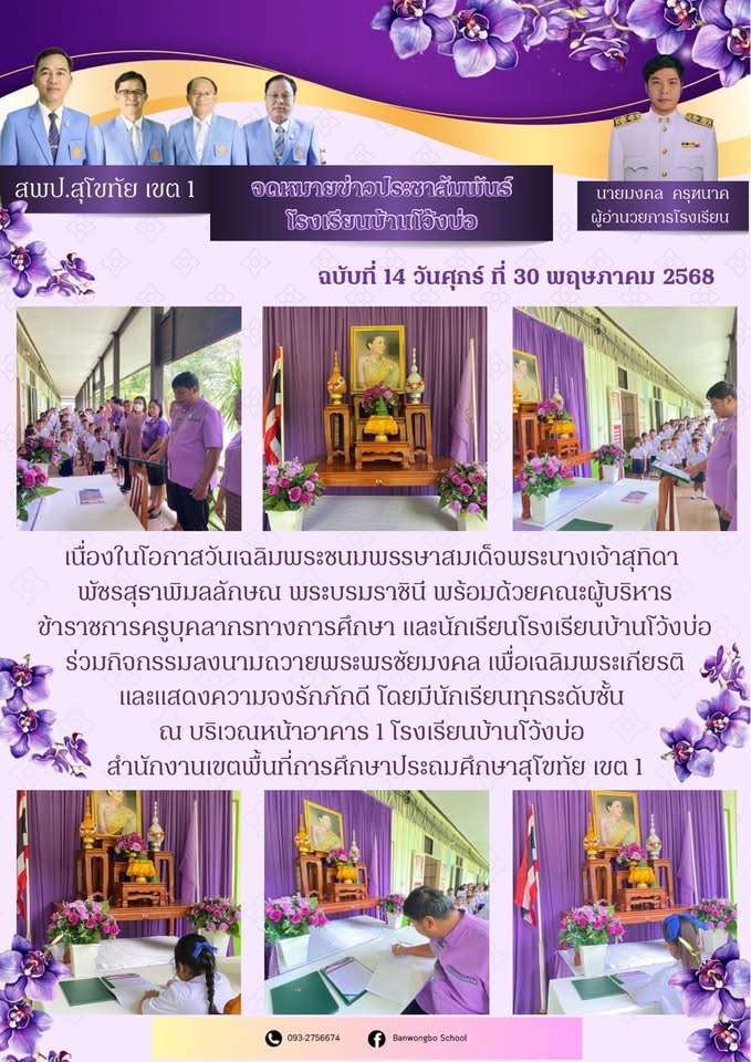เนื่องในโอกาสวันเฉลิมพระชนมพรรษาสมเด็จพระนางเจ้าสุทิดา พัชรสุธาพิมลลักษณ พระบรมราชินี ขอน้อมรำลึกในพระมหากรุณาธิคุณ ร่วมลงนามถวายพระพร ขอพระองค์ทรงพระเจริญยิ่งยืนนาน