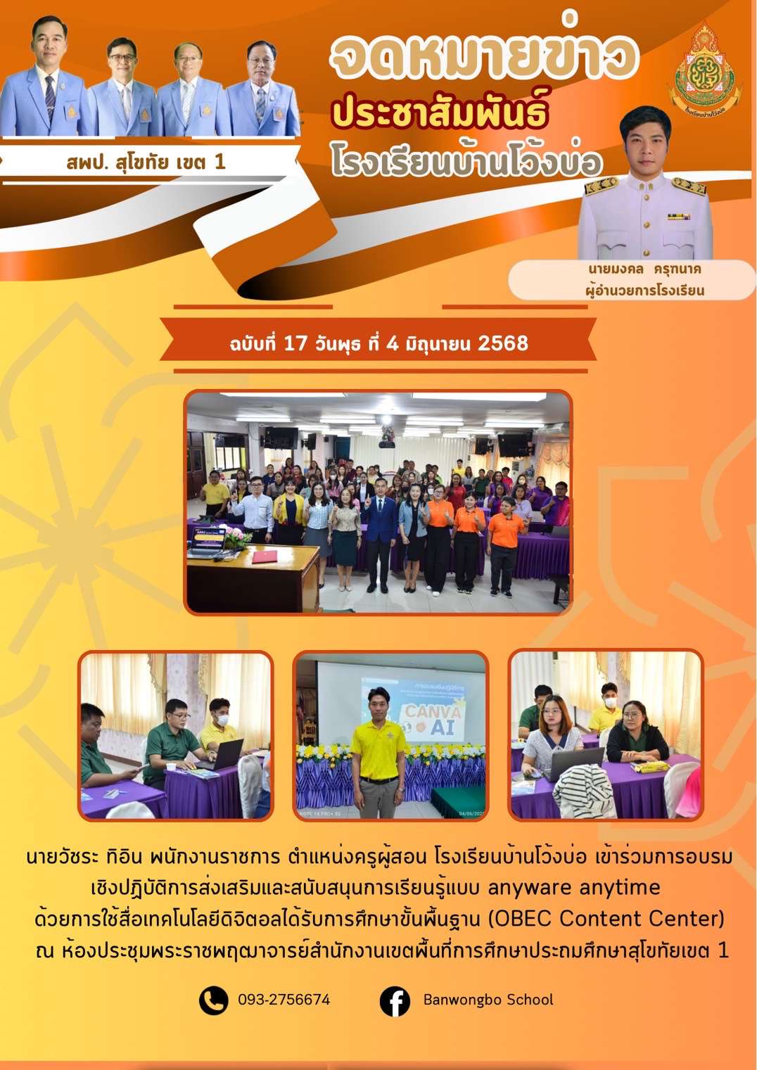นายวัชระ ทิอิน พนักงานราชการ ตำแหน่งครูผู้สอน โรงเรียนบ้านโว้งบ่อ เข้าร่วมการอบรมเชิงปฏิบัติการส่งเสริมและสนับสนุนการเรียนรู้แบบ anyware anytime ด้วยการใช้สื่อเทคโนโลยีดิจิตอลได้รับการศึกษาขั้นพื้นฐาน (OBEC Content Center)
