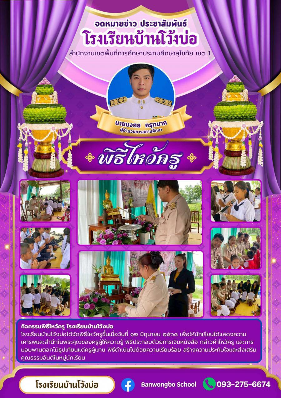 โรงเรียนบ้านโว้งบ่อ ได้จัดพิธีไหว้ครูในวันที่ 12 มิถุนายน 2568 เพื่อให้นักเรียนทุกคนได้แสดงถึงความเคารพ และสำนึกในพระคุณของครูผู้ให้ความรู้พิธีประกอบด้วยการเจิมหนังสือกล่าวคำว่าไหว้ครูและการมอบพานดอกไม้ธูปเทียนแด่คุณครู พิธีดำเนินไปด้วยความเรียบร้อยสร้างความประทับใจและส่งเสริมคุณธรรมอันดีในหมู่นักเรียน